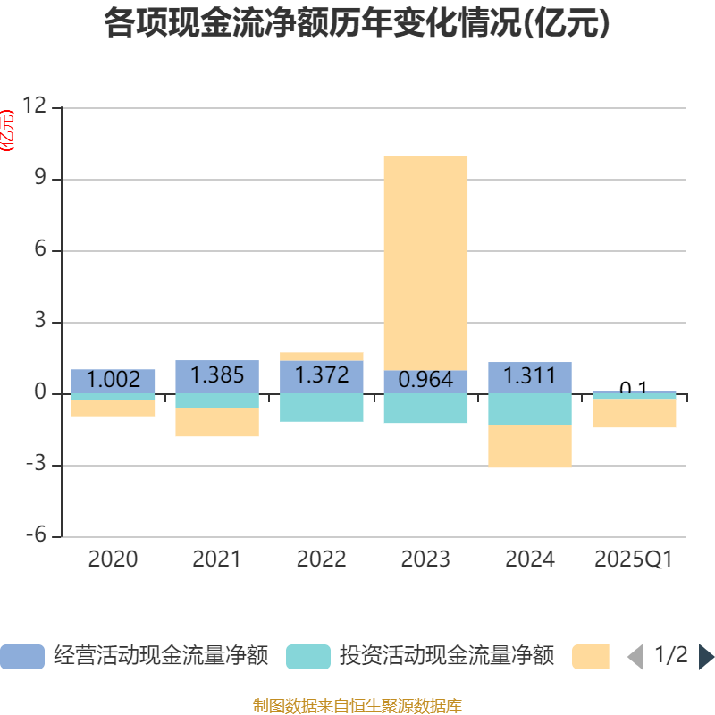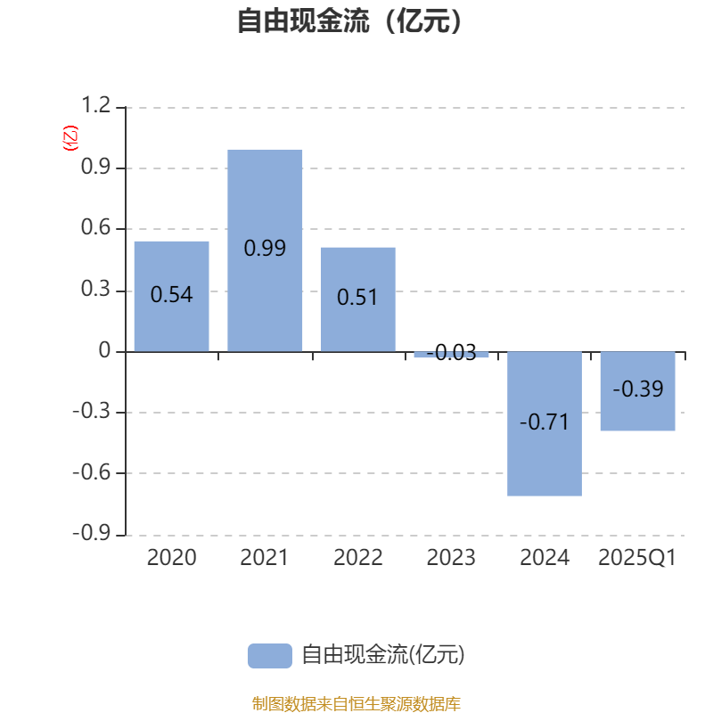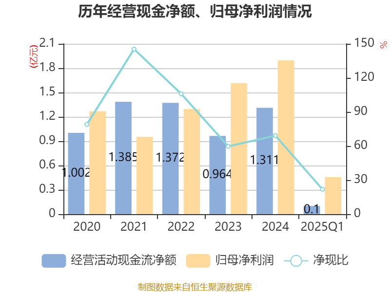 截至2025年一季度末,公司经营活动现金流净额为998.44万元,同比下降21.47%;筹资活动现金流净额-1.19亿元,同比减少1.08亿元;投资活动现金流净额-2395.1万元,上年同期为-6245.02万元。